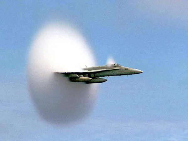 An F/A-18 Hornet assigned to Strike Fighter Squadron One Five One (VFA-151) breaks the sound barrier in the skies over the Pacific Ocean, July 7, 1999. VFA-151 is currently deployed with USS Constellation (CV 64). U.S. Navy photo by Ensign John Gay. [990707-N-6483G-001] July 7, 1999. |